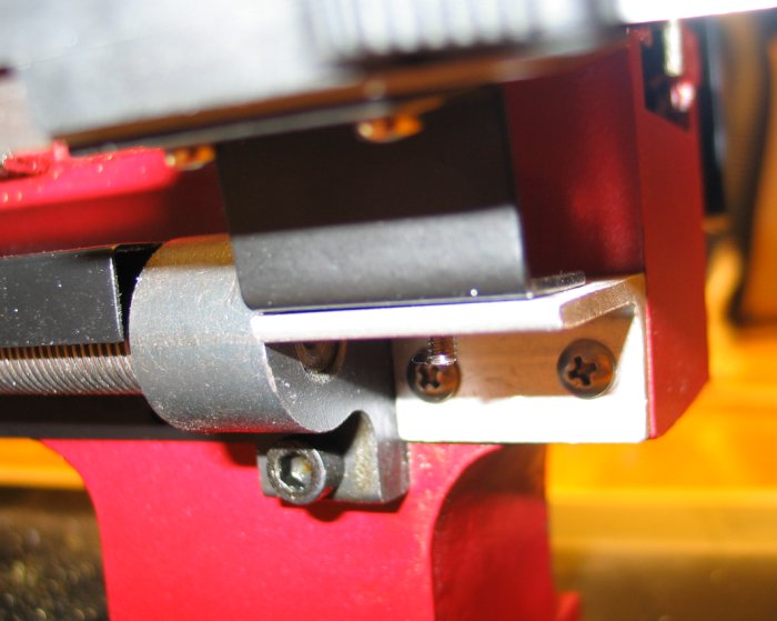 Here are the ends of the DRO on the aluminum brackets that I made. Left end is bolted to the threading indicator hole. Right side is drilled and taped into frame to mount angle bracket. |